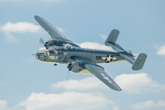 The B-25 Mitchell is painted in the colors of a Marine Corps PBJ-1J, named “Semper Fi” with Globe and Anchor painted on the starboard nose.