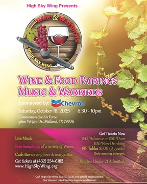 Join us for the 4th annual Wine & Warbirds fundraiser. Enjoy a variety of wines to sample along with delicious food pairings from some of the Permian Basin's restaurants. Enjoy wins in the company of vintage warbirds and live music. A silent auction will also be a part of the evening. All proceeds benefit the CAF High Sky Wing and Midland Army Air Field Museum in Midland, TX.