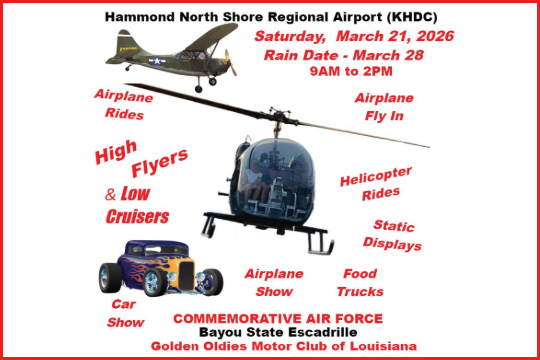 March 21, 2026 Come join us for our 3rd annual ventage car & aircraft show. With the help of The Golden Oldies Car Club, our show raises money for the Commemorative Air Force and The New Orleans Children's Hospital.