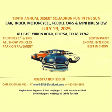 July 19, 2025 10th Annual "Fun in the Sun" Car, Truck, Motorcycle, Peddle Cars, & Minibike Show on Saturday, July 19th! Registration only $30. PUBLIC IS WELCOME TO ATTEND! Contact Mel: emelh5518@outlook.com or 432-559-8961. Trophies 1st & 2nd, Best in Paint, Engine, Interior, & Best in Show. Registration begins at 9 am, Judging at 11 am, Awards 3 pm. Sirloin burgers, hot dogs, & drinks for sale. It's a great time!