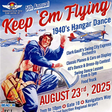 August 23, 2025 - Gates Open 5:00 PM. 6:00-7:00PM Swing Dance Lessons. 7:00-10:00 PM Live Music and Dancing. At the Grand Junction Airport Gate 10 (see map) Featuring WWII-era Planes. Cars, Dress, and Attitude! And of course, 1940s Swing Music!