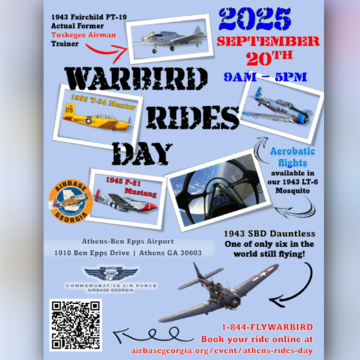September 20, 2025 Join us at Ben Epps Airport in Athens, GA for a ride in one of our classic warbirds. Our entire fleet of rides planes will be in attendance. Book your ride in our P-51, SBD, LT-6, T-34, or PT-19 below!