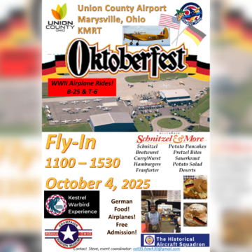 ** October 4, 2025** Oktoberfest Fly-In. 11am – 3:30pm. Marysville, OH. Union County Airport (KMRT), 760 Clymer Rd, Marysville, OH 43040. Come celebrate Oktoberfest pilot style at the Union County Airport in Marysville, Ohio for some authentic German traditions -- Schnitzel, Bratwurst, Curry Wurst, Hamburgers, Frankfurters, Potato Pancakes, Pretzel Bites, Sauerkraut, Potato Salad and deserts -- served up by “A Cut Above Schnitzel” food truck. (https://www.unioncountyohio.gov/Airport-Authority).