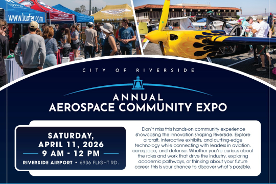 April 11, 2026 The City of Riverside Aerospace Expo will take place on April 11 at the Commemorative Air Force Inland Empire Wing Hangar and Ramp at Riverside Municipal Airport.