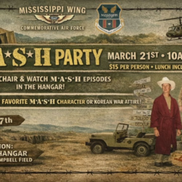 **March 21, 2026** Join us for a day of laughs, nostalgia, and hangar camaraderie at the Mississippi Wing of the Commemorative Air Force M*A*S*H Party! March 21st 10:00 AM – 2:00 PM MS Wing Hangar at Bruce Campbell... Go to event