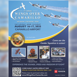 August 16-17, 2025 The Wings Over Camarillo Airshow is back for its 44th annual event, set to take place on August 16-17, 2025, at Camarillo Airport. This year's theme, "Honoring Community Responders," pays tribute to the unwavering commitment by dedicated city and county employees and nonprofit volunteers who came to the aid of the local community members affected by this year’s disastrous wildfires. Airshow gates open to the public at 9:00 a.m. on both days. The airport is located at 555 Airport Way, Camarillo, CA 93010. Tickets for this multifaceted event are available online at www.WingsOverCamarillo.com.