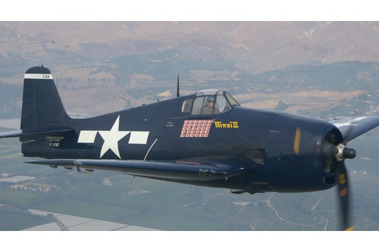 The CAF’s F6F-5 Hellcat in flight. It has been painted in the colors of Cmdr. David McCampbell, U.S. Navy, Air Group Commander of VF-15 on the USS Essex during World War II.