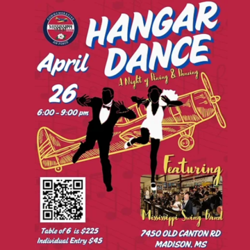 April 26, 2025 Here's the updated event description with Mississippi Swing Band featured: Step Back in Time at the Mississippi Wing’s Hangar Dance! Get ready to swing the night away at the Mississippi Wing's Hangar Dance on Friday, April 26, 2025, from 6:00 PM to 9:00 PM