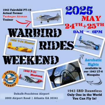 May 24-25, 2025 Join us at Dekalb-Peachtree Airport in Atlanta for a ride in one of our classic warbirds. Our entire fleet of rides planes will be in attendance. Book your ride in our P-51, SBD, LT-6, T-34, or PT-19 below!