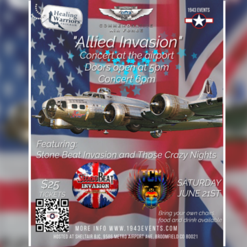 June 21, 2025 Join is for an evening of music and airplanes. The "Allied Invasion" will feature two of Denver's great bands Stone Beat Invasion and Those Crazy Nights providing music and entertainment! Tickets now for sale. $25 We will have some amazing vintage airplanes join us on the ramp for the concert. These include B-17 Sentimental Journey, B-25 Maid in the Shade, P-51, T-6, Steaman and others. Great food provided by Blue Sky Bistro