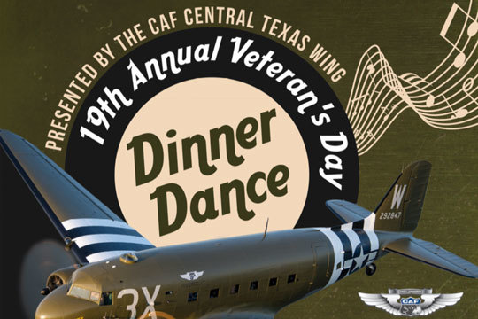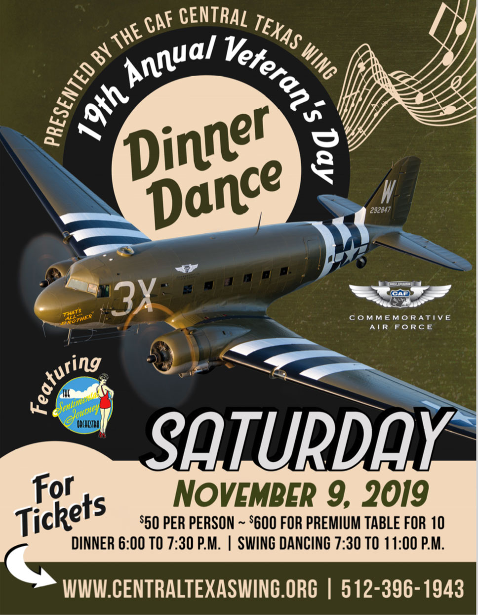 Veteran's Day Dance Tickets are now on sale. Tickets may be purchased on line at www.centraltexaswing.org or by calling Peggy at 512-805-8226 or the hangar at 512-396-1943.
