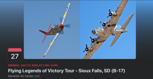 Time and Date: Monday, July 27, 2020 at 2 PM – 6 PM-The B-17 Bomber “Sentimental Journey” will be in Sioux Falls, SD July 27 – August 2, 2020. One of the rarest historical military planes in the world will be near you. Come see it up close and personal, and better yet fly in it! The B-17 Bomber is a heavy bomber bristling with armament. They earned a deadly reputation and were legendary for their ability to return home after taking brutal poundings. Over 12,000 of these iconic planes were built for WWII, and Sentimental Journey is one of only five still regularly flying today. Also appearing is the famed P-51C Mustang "Tuskegee Airmen. The P-51 Mustang aircraft manufactured by North American Aviation for use as a fighter in World War II made it’s debut in 1940, going into service in 1942 with the Royal Air Force, then in 1942 with the US Army Air Corps. TOURS: Mon/Fri-Sun: 2p – 6p Tue-Thurs: 9a – 6p $10 per person/$20 for a family of 4 (in US and Canada) Purchase tour tickets at the airplane, no reservation required. RIDES: Fri-Sun: 9a – 1p To book a ride, click the ticket link below! We encourage everyone to come out and tour our plane(s). However, due to the current COVID-19 pandemic and to keep everyone safe, we ask the following: • If you are experiencing any COVID-19 symptoms, please stay at home • Please maintain social distancing while waiting in line to make purchases at our trailer; waiting in line for airplane tours or when inside the plane • Wearing a face covering is optional or as required by local restrictions Note that schedule may be affected by weather and logistics and is subject to change.