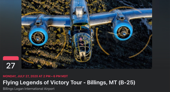 Time and Date: Monday, July 27, 2020 at 2 PM – 6 PM MDT-The B-25 Bomber “Maid in the Shade” will be in Billings, MT July 27 – August 2, 2020. One of the rarest historical military planes in the world will be near you. Come see it up close and personal, and better yet fly in it! Departing from the Billings Logan International Airport. We have a limited number of seats, flights are filling up fast. Built in 1944, the B-25 was developed by North American Aviation and used mainly as a low altitude strafe and skip bomber. Nearly 10,000 B-25s were produced and the B-25 Mitchell “Maid in the Shade” is one of 34 still flying today. TOURS: Mon/Fri-Sun: 2p – 6p Tue-Thurs: 9a – 6p $10 per person/$20 for a family of 4 (in US and Canada) Purchase tour tickets at the airplane, no reservation required. RIDES: Fri-Sun: 9a – 1p To book a ride, click the ticket link below! We encourage everyone to come out and tour our plane(s). However, due to the current COVID-19 pandemic and to keep everyone safe, we ask the following: • If you are experiencing any COVID-19 symptoms, please stay at home • Please maintain social distancing while waiting in line to make purchases at our trailer; waiting in line for airplane tours or when inside the plane • Wearing a face covering is optional or as required by local restrictions Note that schedule may be affected by weather and logistics and is subject to change.