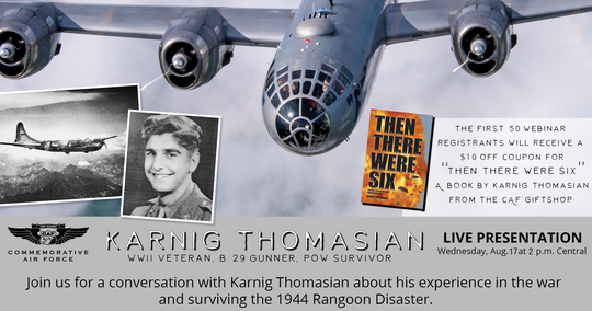 Time and Date: Monday, Aug 17th at 2 p.m. Central time- Join us for a conversation with Karnig Thomasian about his experience as a young solider. Thomasian left New York City to join the war effort and fight for freedom. He will discuss his participation and survival in the Rangoon Disaster. An ill fated mission where only one of the 11 B-29 Superfortresses on the mission returned to homebase. Eighteen men died, 29 airmen were captured, Thomasian was one of the men whom survived thanks to his quick thinking, sturdy parachute, and a strong will to make it back home.