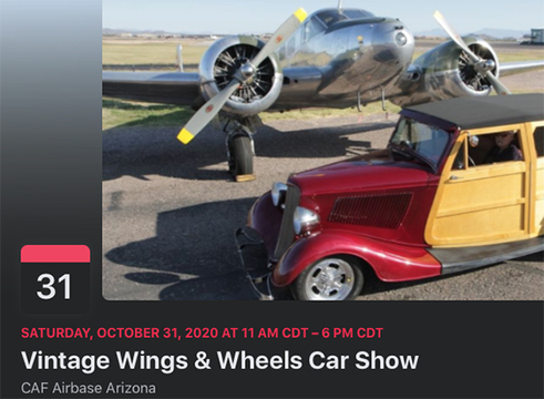 Saturday, October 31, 2020 at 11 AM CDT – 6 PM CDT-Time to get on out here and have fun! The fourth annual show will feature vintage warbirds, restored classic cars, living history flights in aircraft and admission to the east valley's top-rated museum. Food truck on site! Large outdoor event and spacious exhibit area enables easy AND exciting social distancing. Participants are reminded to wear masks in areas where open air and social distancing are difficult. Museum doors open for visitors at 9 am and remain open until 4 pm. Regular adult admission $15 with discounts for seniors and children. Active duty military free!
