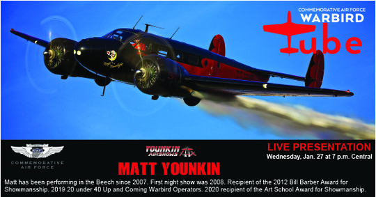 Matt has been performing in the Beech since 2007. First night show was 2008. Recipient of the 2012 Bill Barber Award for Showmansship. 2019 20 under 40 Up and Coming Warbird Operators. 2020 recipient of the Art School Award for Showmanship. Don't miss out on this wonderful webinar.