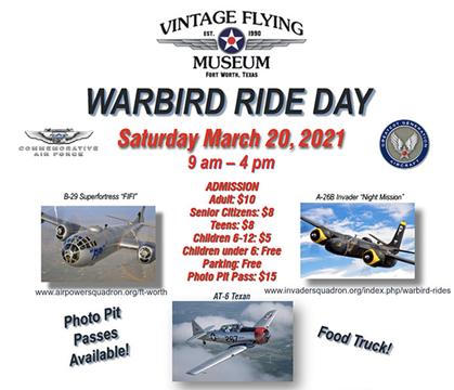 Don’t miss your opportunity to fly in the world's most famous flying B-29 Superfortress when “FIFI” comes to Fort Worth! Joining FIFI will be a T-6 Texan and a PT-13 Stearman for this one-day event. Book a flight in one or all of these historic aircraft! Rides Only, no ground tours at this event. Get more information and book your ride today at https://www.airpowersquadron.org/forth-worth