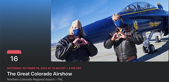 Join us for the Great Colorado Airshow which coincides with the Blue Angels' 75th Anniversary! Oct 16 and 17, 2021