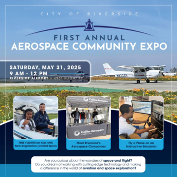 May 31, 2025 Ready for takeoff, Riverside? Don’t miss the First Annual Aerospace Community Expo — a free, family-friendly event where you can take to the skies, explore aircraft, aerospace careers, and test your pilot skills on an interactive flight simulator! Saturday, May 31 9:00 AM – 12:00 PM Riverside Airport | 6951 Flight Rd. The future of flight is waiting — and it starts here. For more information, visit: RiversideCA.gov/AerospaceExpo
