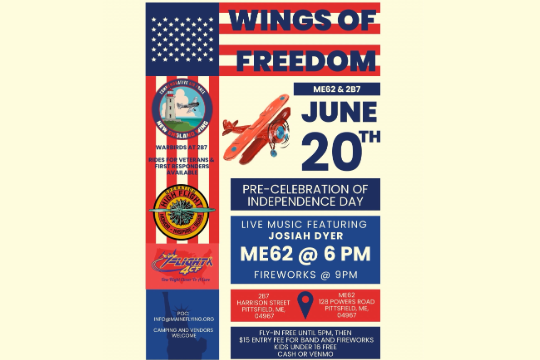 June 20, 2026Everything after 5pm is a rain or shine Saturday. BBQ will go on after 5pm Band will play around 6pm at ME62 Fireworks will happen around 9pm if the weather holds out. The Bent Propeller Club is open for entertaining with spill over into the south hangar where the band will be playing. We plan to set up a few tents for the outside space just in case. Wings of Freedom is our Annual Pre-4th of July Celebration. This year's event will be a fundraiser for the Commemorative Air Force New England Wing and MCCA. Fly ins are welcome and encouraged. The CAFNEW intended to bring their PT-23 to the Pittsfield Municipal Airport (2B7) and actively coordinate for others to join us. There will be a local based PT-17 flying as well. If you have a pre-war trainer and want to attend, please let us know! FREE to come and look at the field and planes, but after 5pm will be a donation for a wrist band for live music and fireworks.