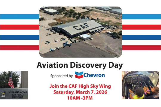 March 7, 2026 The community is invited to the Midland Army Air Field Museum to experience the sights & sounds of World War II. See historic aircraft, view military vehicles, and tour the museum. Talk to pilots, mechanics, veterans and CAF members about history, being a docent, or a career in Aviation. Be the first to see the opening of a NEW exhibit "OIL, AVIATION, & VICTORY IN WWII"• Food trucks on site to purchase lunch 11:00 to 2:00. Admission is FREE, donations always welcome. Aircraft are encouraged to