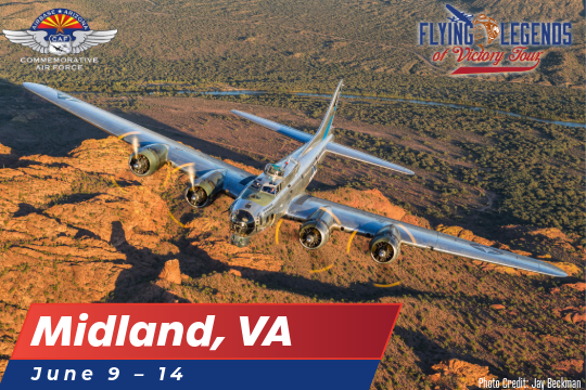 June 9-14, 2026Not everyone can visit the Airbase Arizona Museum for an up-close and personal inspection of our historic warbirds. So, in the summer, we take our World War II planes to the public to fulfill our mission of educating generations about the role of aviation in combat history. The Flying Legends of Victory Tour, starts in May and ends in September. Our flying warbirds travel to cities in the US and Canada. Keep your eyes to the skies when our B-25 Maid in the Shade and B-17 Sentimental Journey fly overhead to their next destination. And come visit us when we’re in your town. Rides and tours are available, but be sure to book your seat in advance because we’ll only be there for a limited time.
