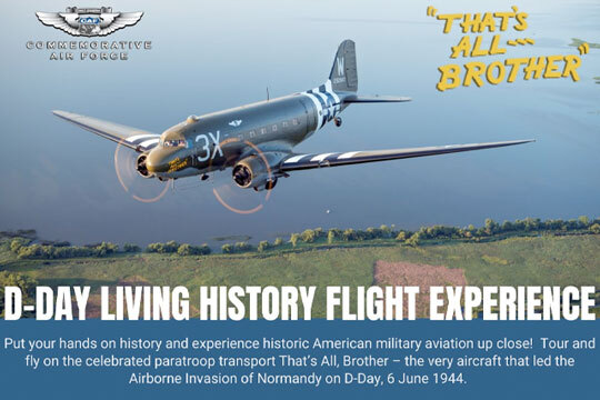 D-Day Living History Flight Experience - Join us at the War Eagles Air Museum. That’s All, Brother*is the C-47A troop carrier aircraft that led the main airborne Invasion on D-Day, June 6, 1944, carrying 101st Airborne Division paratroopers into France during the D-Day invasion. During the remainder of WWII, *That’s All, Brother served in Operation Dragoon, Market Garden, the Relief of Bastogne, and Operation Varsity.