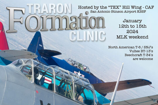Must be CAF and TRARON members. Open to AT-6, SNJ, BT-13 and T-34 The point of contact is Col Chris Watson formationclinic@texhillwing.org