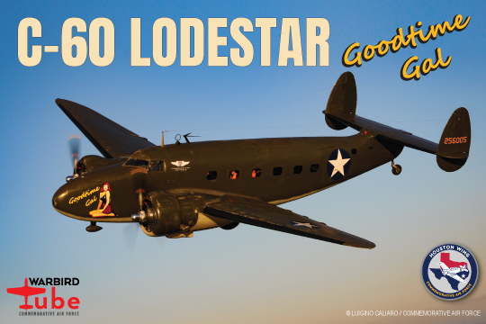 ONLINE EVENT The C-60A is a twin-engine transport based on Lockheed’s Model 18 Lodestar. The Model 18 was a civilian airliner like the DC3, but slightly smaller and a little faster. During the War, the C-60 was used as a cargo aircraft, VIP transport, and paratroop transport. The C-60s also served stateside as tow aircraft for training glider pilots. Most C-47s were sent to fighting units overseas in Europe and Pacific theaters. The CAF’s C-60 Lodestar is assigned to the Houston Wing. She was built in 1943 and carries the name and Nose Art “Goodtime Gal.” She is configured as a paratroop transport, complete with jump lights and a static line hookup. Join Houston Wing members on this episode and learn more about Goodtime Gal.