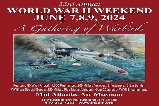 Featuring 80 WIlI Airaft, 1,500 Reenactors, 200 Milliary Vehicles, Entertainers, 2 Big Bands, WWil era Special Guests, 250 Military Flea Market Vendors. Over 20 acres of WWIl Encampments. Mid Atlantic Air Museum