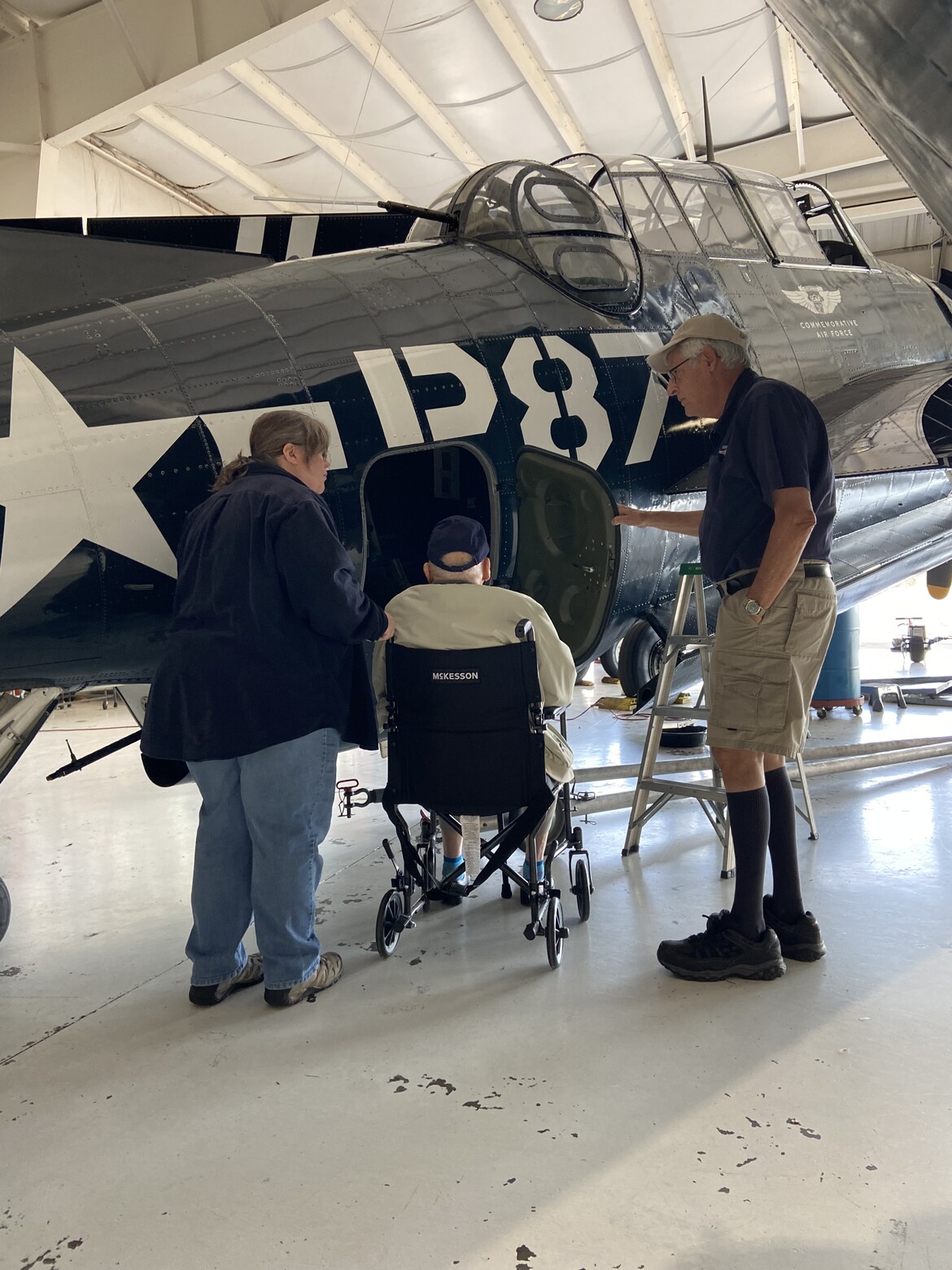 While visiting the Capital Wing, Major Elliot had an opportunity to see all our aircraft, including the TBM Avenger, Doris Mae. Also in this photo is his friend Annette and CAF Capital Wing volunteer, Barry Toms.