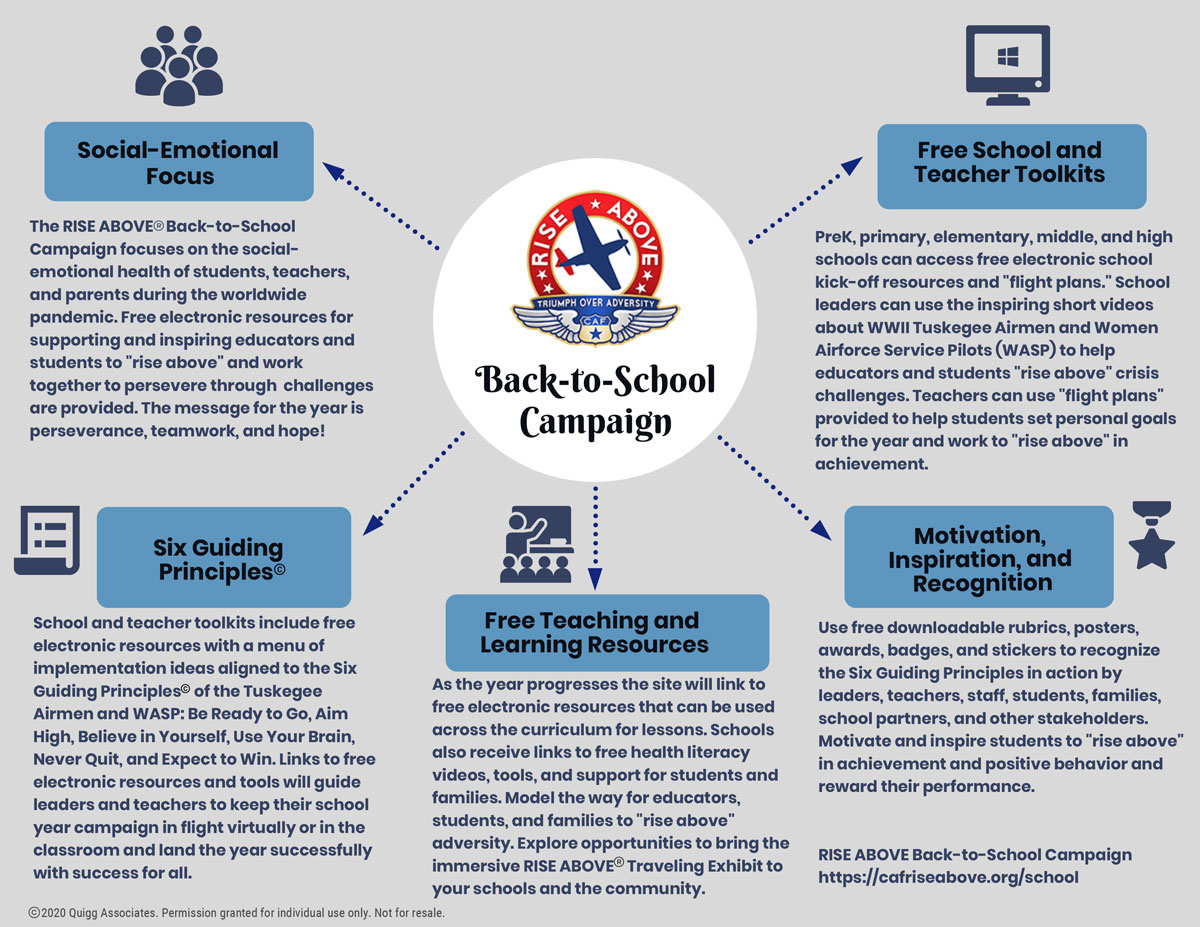 (DALLAS – June 22, 2020) The Commemorative Air Force (CAF) RISE ABOVE Squadron has launched a new program featuring the stories of the Tuskegee Airmen and Women Airforce Service Pilots (WASP) and focused on the social-emotional health of students as they begin the next school year during this worldwide pandemic. The RISE ABOVE Back-to-School Campaign will provide free electronic resources to support and inspire educators and students to Triumph Over Adversity and work together to persevere through their challenges. School kick-off resources and "flight plans will be available for PreK, primary, elementary, middle, and high schools. Inspiring short videos about WWII Tuskegee Airmen and Women Airforce Service Pilots (WASP) are also included to help educators and students "rise above” crisis challenges. Teachers can use these resources to provide help to students setting personal achievement goals for the year.