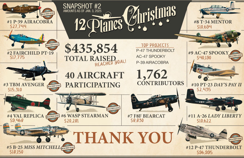 Dallas, TX (January 3, 2025) – The Commemorative Air Force (CAF) is thrilled to announce the totals for the 2024 12 Planes of Christmas annual fundraising campaign, which concluded on January 1, 2025. This year’s campaign raised over $435,854, including over $40,000 dedicated to the Restoration Grant Fund. Donations continue to roll in, underscoring the enduring passion for preserving aviation history.