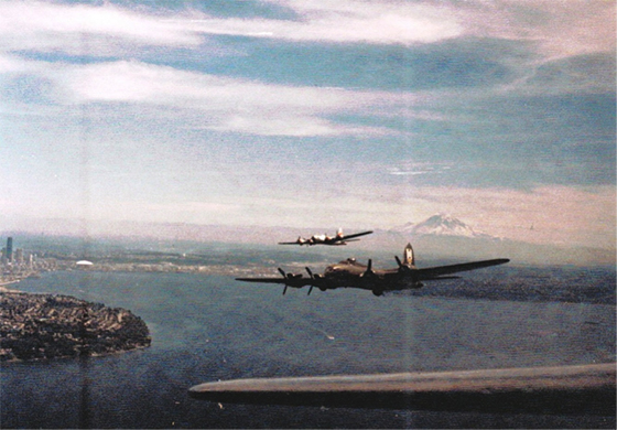 Captions: Museum of Flight’s silver B-17F and Dave Tallichet’s B-17G over Puget Sound, with Mt. Rainer in the