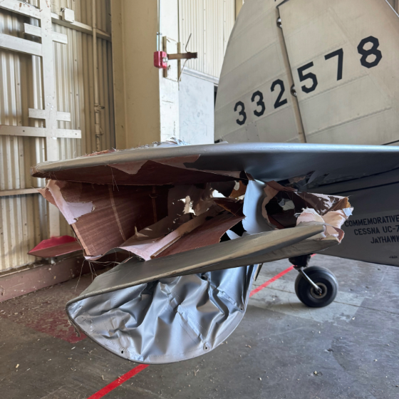 Wichita, KS (January 30, 2025) - After months of dedication and hard work, the Commemorative Air Force (CAF) Jayhawk Wing’s UC-78 Bobcat has returned home. The aircraft, which sustained damage during a microburst at McConnell Air Force Base last August, was successfully repaired and returned to the Jayhawk Wing hangar on January 22.