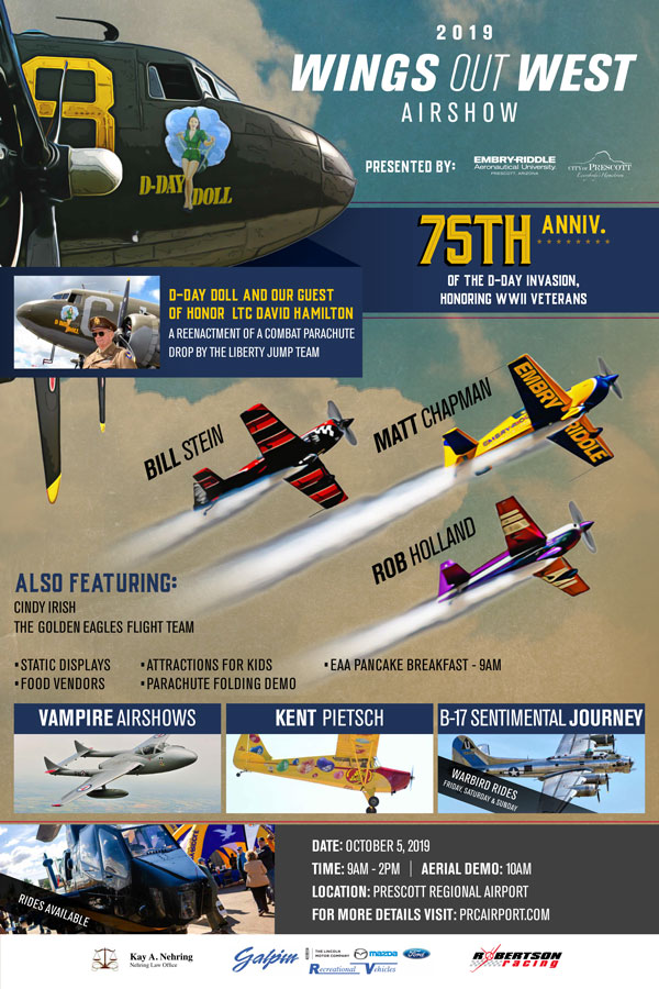 September 26, 2019, Prescott, AZ – On October 5, 2019 the Wings Out West Airshow presented by Embry Riddle will pay a special tribute to the 75th Anniversary of D-Day with several events and appearances. The Guest of honor will be Lt. Col. David Hamilton the last living Pathfinder pilot of D-Day. Hamilton will be joined by CAF’s C-53 D-Day Doll, an aircraft which also participated in D-Day, and a special jump performed by the Liberty Jump Team.