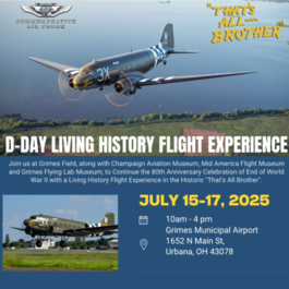 July 15-17, 2025 Join us at Grimes Field, along with Champaign Aviation Museum, Mid America Flight Museum and Grimes Flying Lab Museum, to Continue the 80th Anniversary Celebration of End of World War Il with a Living History Flight Experience in the Historic "That's All Brother".