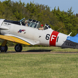 The T-6 based in our hangar is the Navy version known as the SNJ-4. The aircraft is owned by the CAF. It came off the assembly line in 1943. Its operational history is currently being investigated. The AT-6 advanced trainer was one of the most widely used aircraft in history. Evolving from the BC-1 basic combat trainer ordered in 1937, 19,757 Texans were built between 1938 and 1945. The AAF procured 10,057 AT-6s; others went to the Navy as SNJs and to more than 30 Allied nations. Production continued in Canada until 1954. Japan acquired a license to build the BC-1 in 1939. The Japanese Navy procured 176 for use as intermediate trainers designated Kyushu K10W1. The Allied code name was... ...