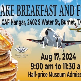 The CAF Highland Lakes Squadron invites the Public to a Community Pancake Breakfast & Fly-in on Saturday, August 17th from 9:00 - 11:30 at the Burnet Municipal Airport. Museum Admission is half-price all day: Adults $5.00; Veterans/Military/Seniors 65+ and Youth 12-17 $2.50; Kids 6-11 $1.50 and Children 5 and under are free. Breakfast by donation.