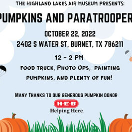 The Highland Lakes Squadron and Air Museum present PUMPKINS AND PARATROOPERS on October 28, 2023, from noon to 2 p.m. Join us and climb inside the C-47 Texas Zephyr, pose with the Bell 47 helicopter, and check out various vintage military vehicles. Other activities include pumpkin painting, museum tours, and food trucks.